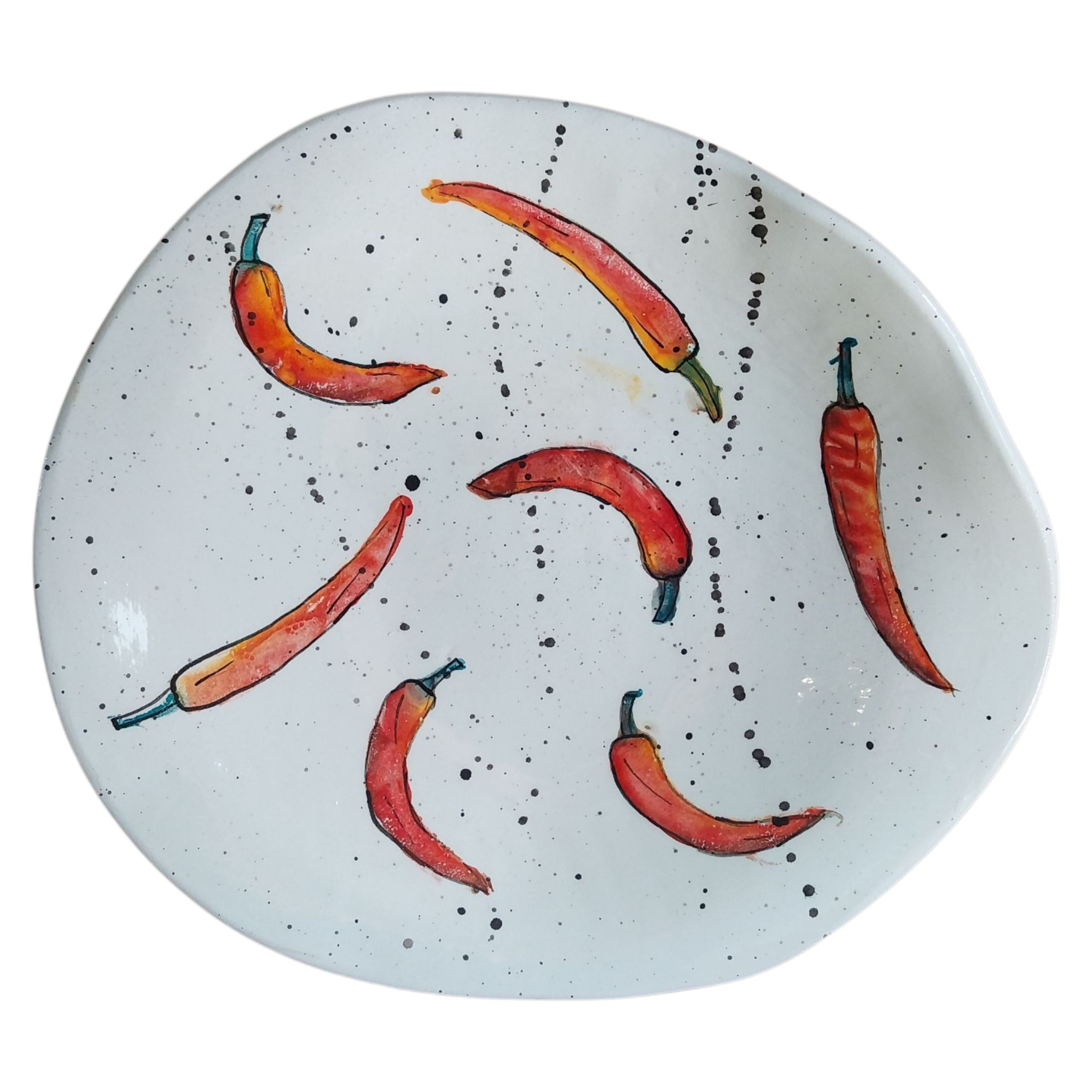 , transmite energía, color y una sensación de frescura inspirada en la cocina mediterránea y los ingredientes naturales. El fondo blanco moteado con pequeñas salpicaduras negras aporta contraste y textura, realzando el tono vibrante de las guindillas pintadas con pinceladas artesanales. Gracias a su acabado vitrificado, este plato es