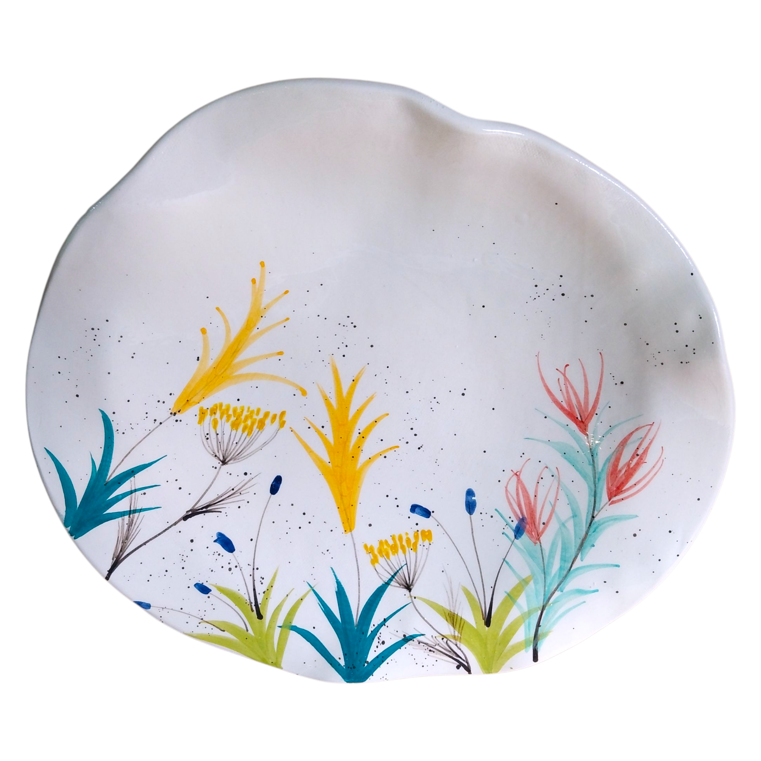 , lo que garantiza un acabado original e irrepetible. Su forma orgánica y su decoración con motivos florales en tonos vivos aportan un toque natural y elegante a cualquier mesa. Perfecto para uso diario o para exhibir como pieza decorativa. Además, es