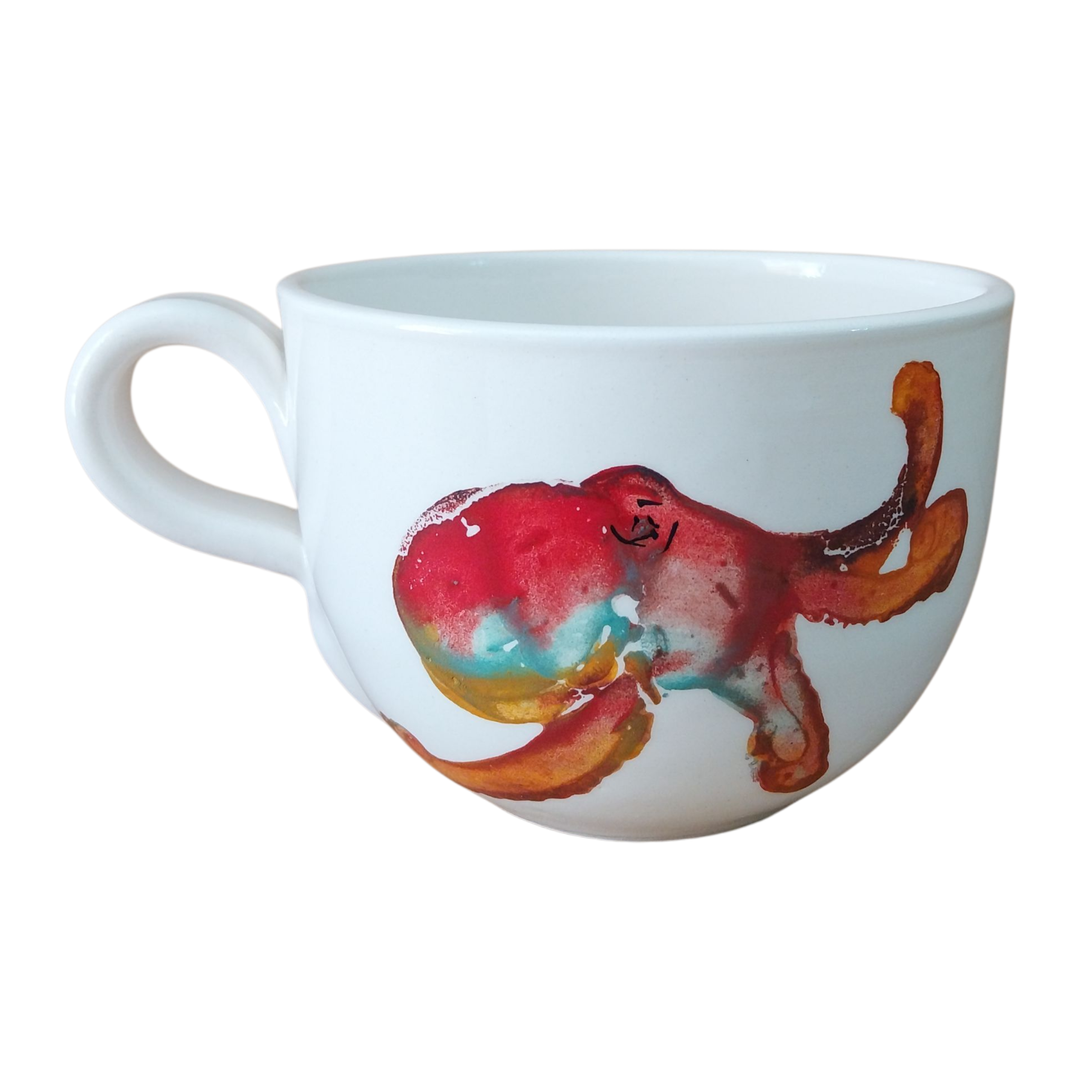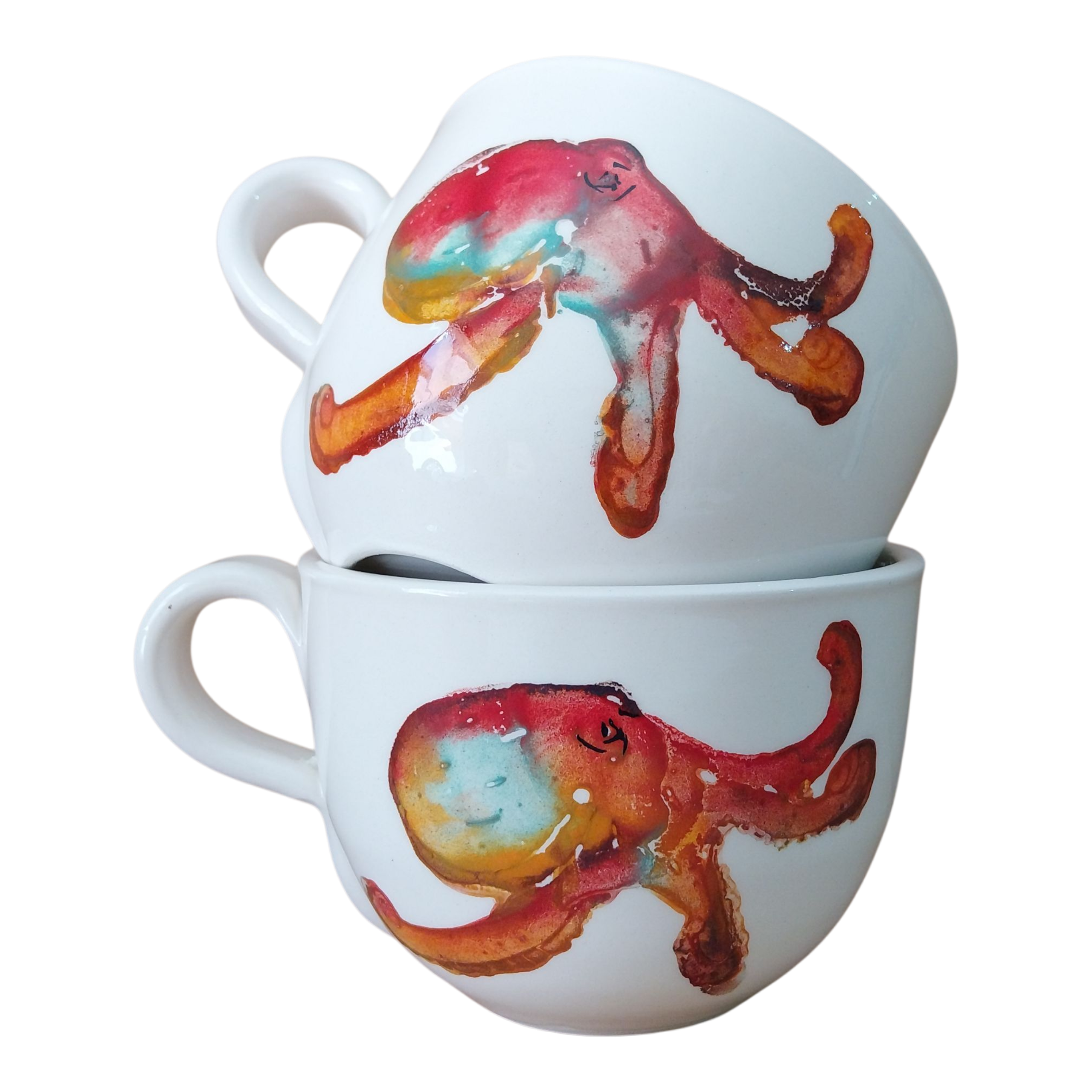 Nuestra taza de desayuno, inspirada en el encanto del Mediterráneo, presenta un diseño pintado a mano de un pulpo en tonos rojos, naranja y verde mar. Perfecta para aquellos que aprecian la belleza natural y el arte. Con capacidad para tu bebida favorita, esta taza no solo es decorativa, sino también funcional.