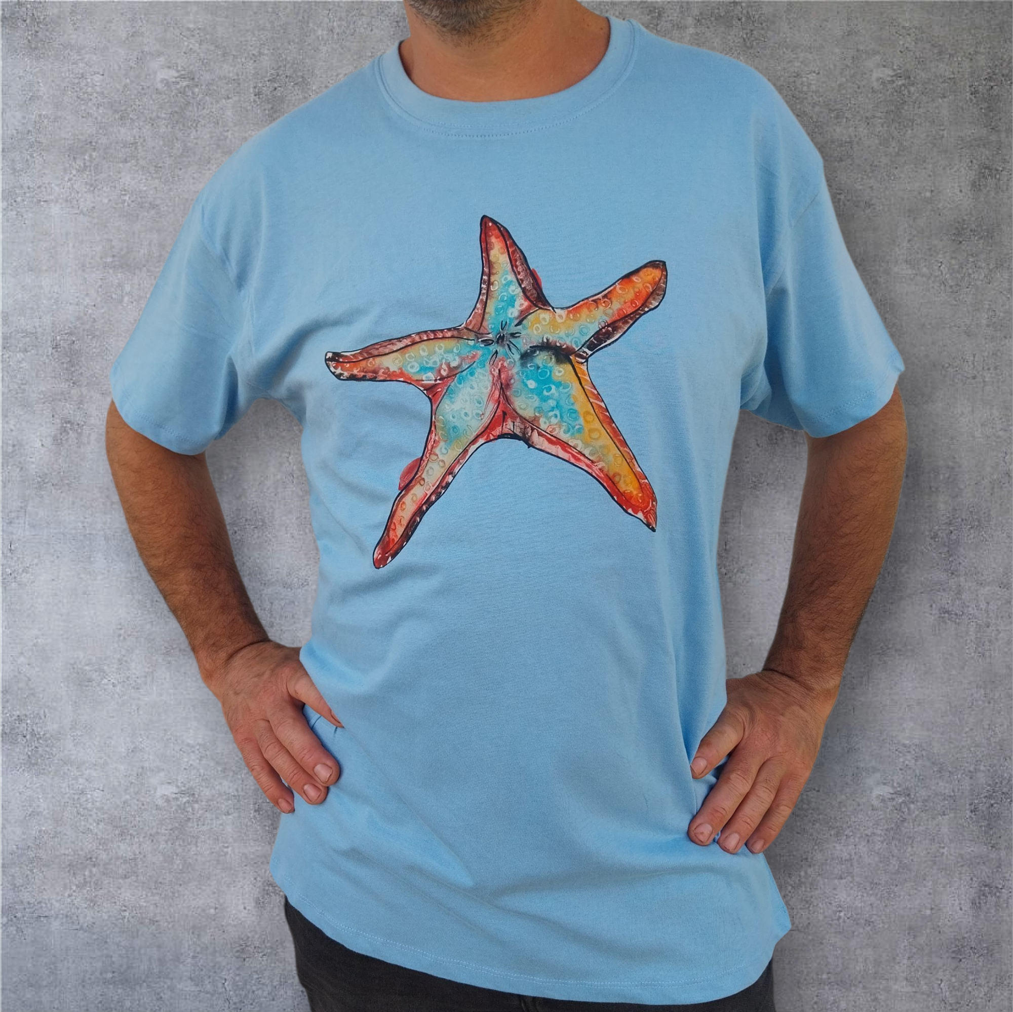 Camiseta de manga corta confeccionada en algodón 100%. Color azul claro con estampado central de una estrella de mar multicolor. Corte clásico, cuello redondo y tejido suave al tacto. Adecuada para uso diario y combinable con diferentes estilos informales. Disponible en varias tallas.