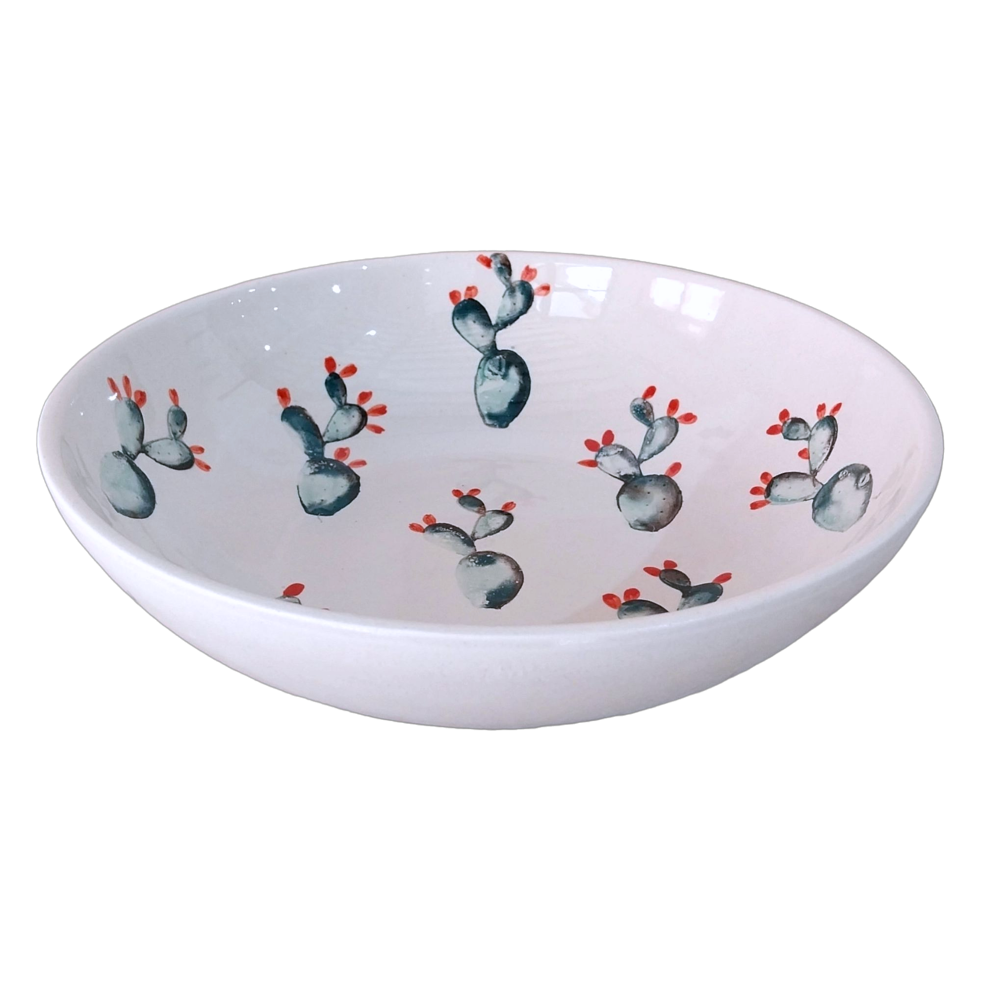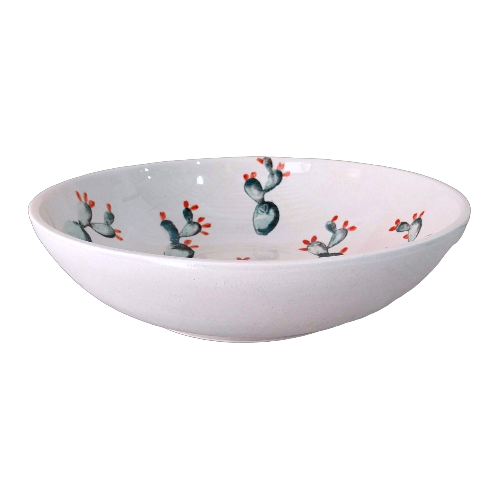Ensaladera Extra de cerámica decorada con dibujos de cactus en tonos verdes y detalles naranjas que representan los frutos del higo chumbo. Su tamaño y forma la hacen práctica para servir ensaladas, frutas o pastas. Fabricada en cerámica resistente, es apta para lavavajillas, lo que facilita su limpieza y mantenimiento. Ideal para uso doméstico o profesional.