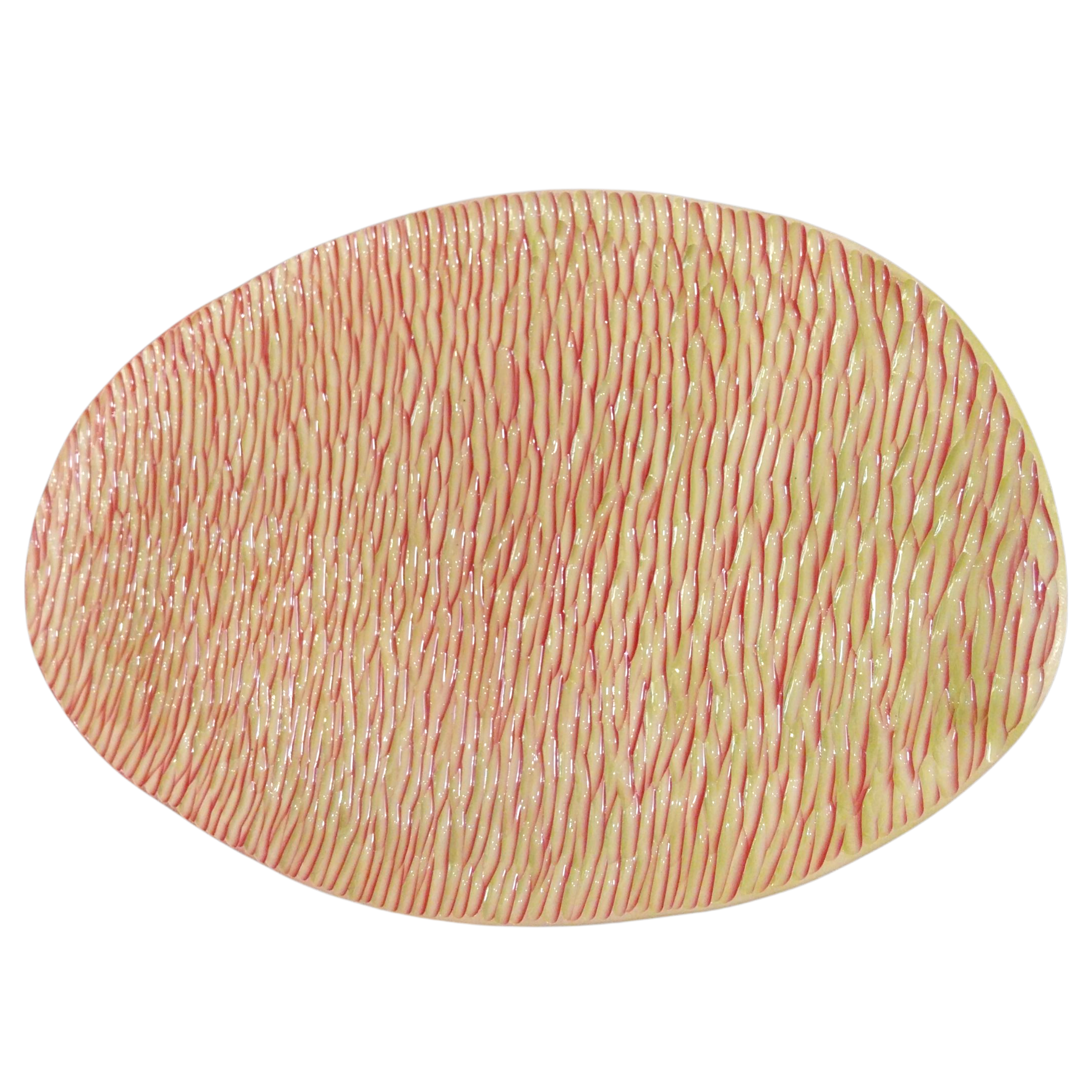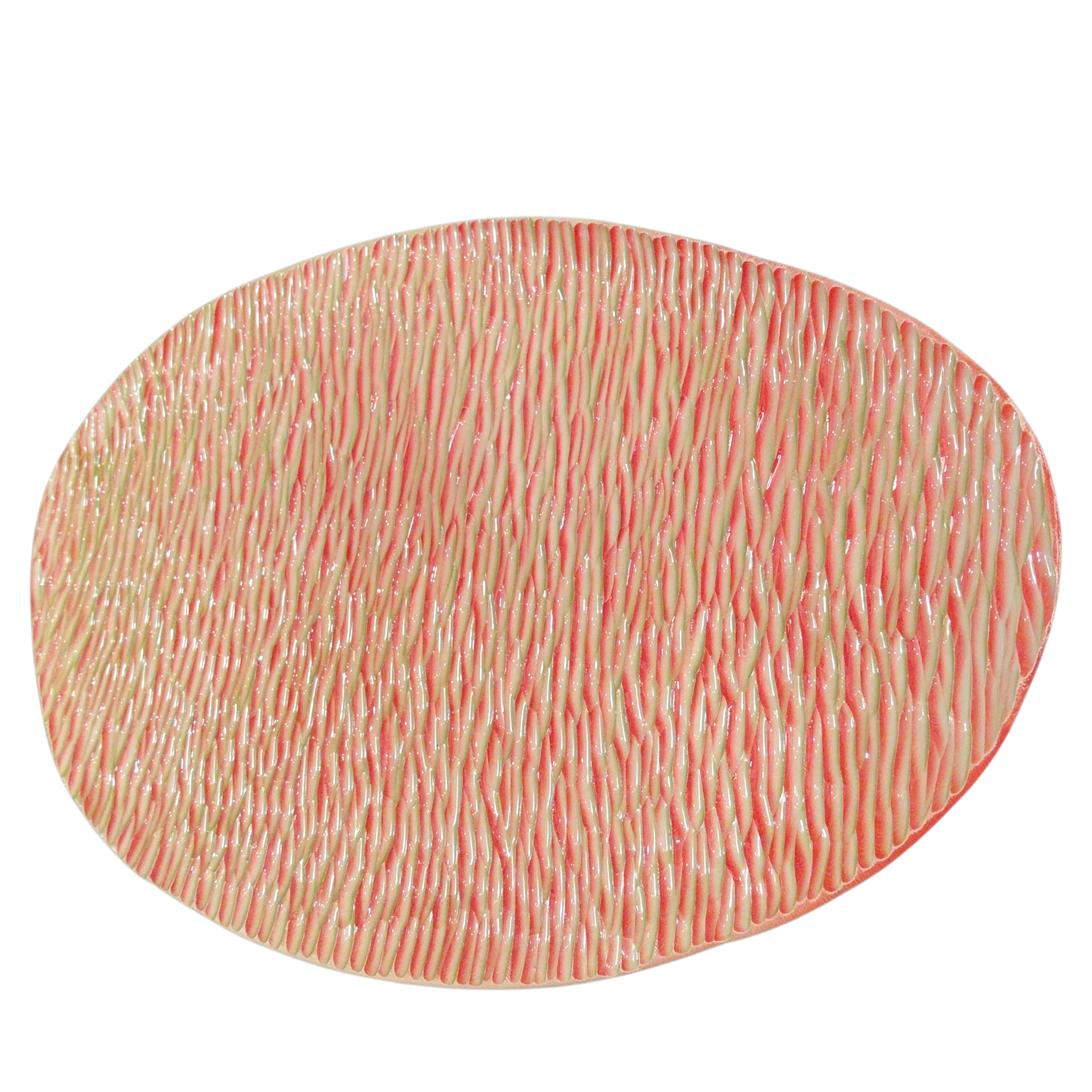 Plato de cerámica XXL con forma irregular y diseño texturizado. Su superficie presenta un efecto bicolor en tonos rojo y verde pistacho, que cambia ligeramente según el ángulo de la luz y la posición de quien lo observa. Esta pieza combina funcionalidad y estilo, siendo adecuada tanto para su uso en la mesa como para fines decorativos. Su acabado artesanal y su tamaño lo convierten en un elemento versátil, ideal para resaltar cualquier espacio con un toque distintivo sin perder practicidad.