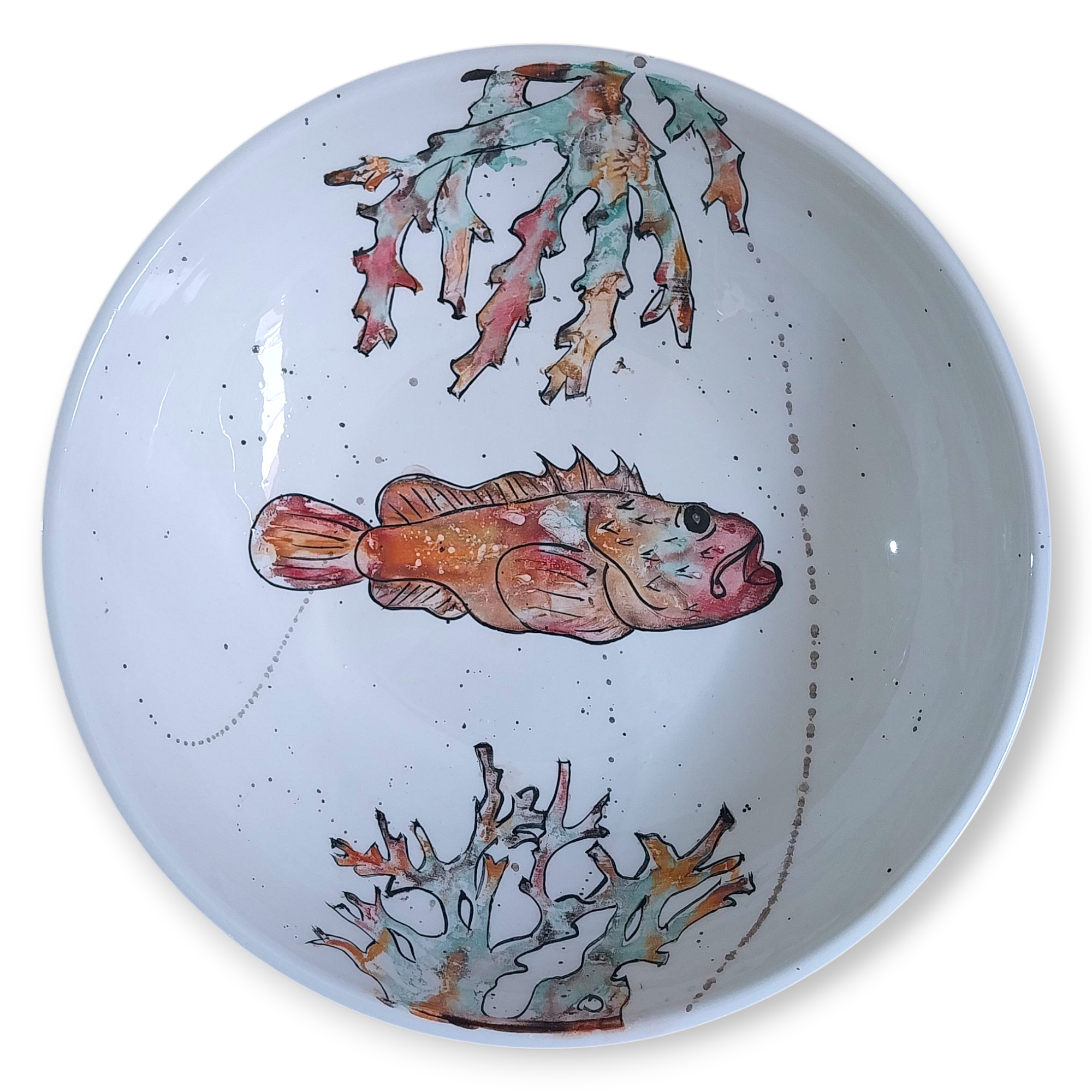 Immerse yourself in the beauty of the Mediterranean with our artisanal salad bowl "Caproig y Coral". Inspired by the vibrant seabed, this 31 cm diameter work is a tribute to underwater nature. Made of delicate white ceramic, its concave design is a canvas for a captivating marine scene. In it, a caproig (typical Mediterranean fish) and two corals shine in bright red, orange and sea green colors. This salad bowl is not just a container for your salads; It is a centerpiece that adds a touch of craftsmanship and marine charm to your table. It is perfect for lovers of art, nature and crafts, who seek to incorporate unique and meaningful elements into their daily lives. A fusion of functionality and aesthetics inspired by the serenity of the Mediterranean.