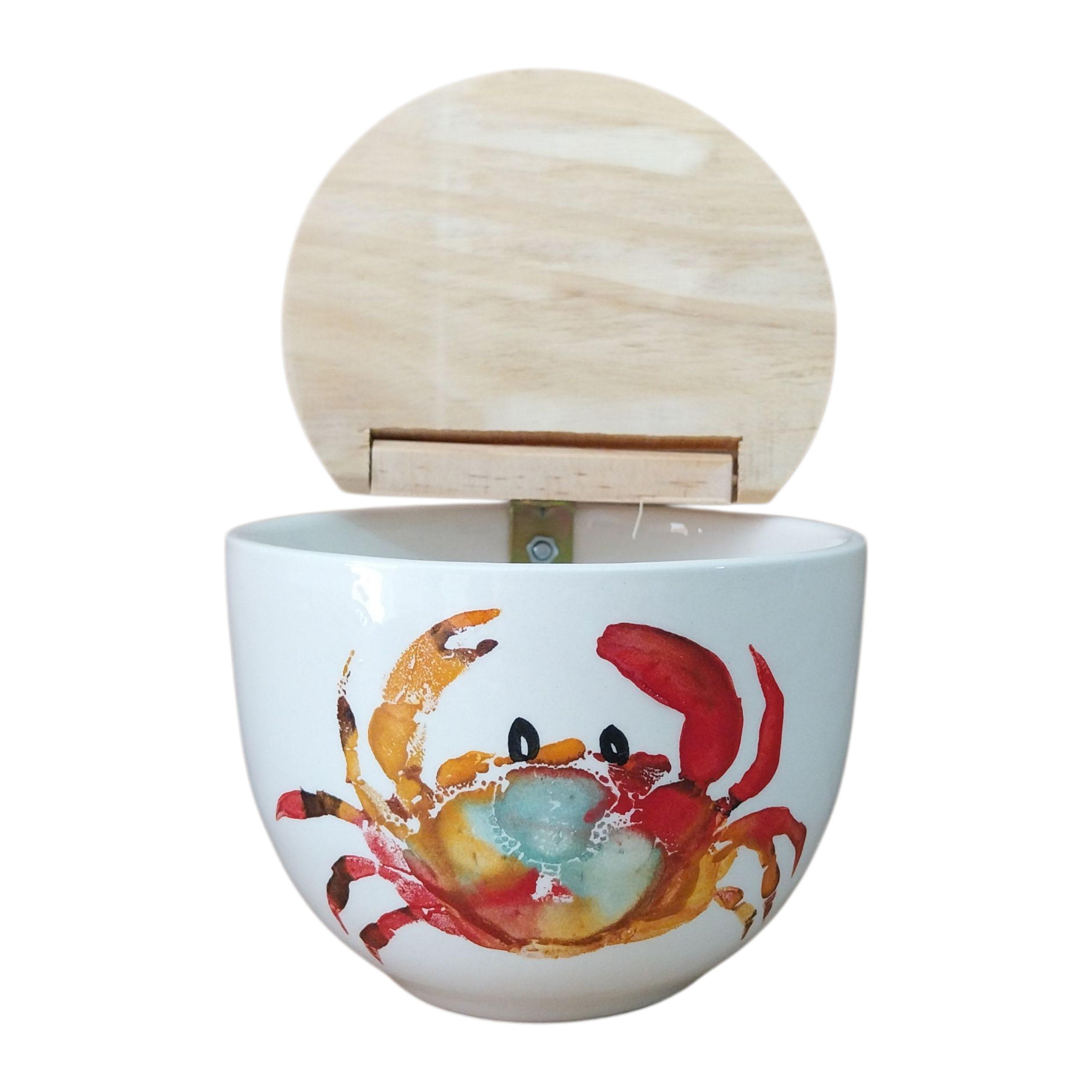 Descubre nuestro encantador salero de cerámica en color blanco, adornado con una tapa de madera y un hermoso dibujo a mano de un cangrejo rojo, naranja y verde mar. Cada pieza es creada con amor en nuestro taller ABco Pottery Studio, ubicado en Pollensa, Mallorca, en las hermosas Islas Baleares de España. Inspirado en los fascinantes fondos marinos del Mediterráneo, este salero no solo es funcional, sino también una pieza de arte única que agregará un toque especial a tu cocina. ¡Hazte con este salero exclusivo y lleva un pedacito del mar a tu hogar!