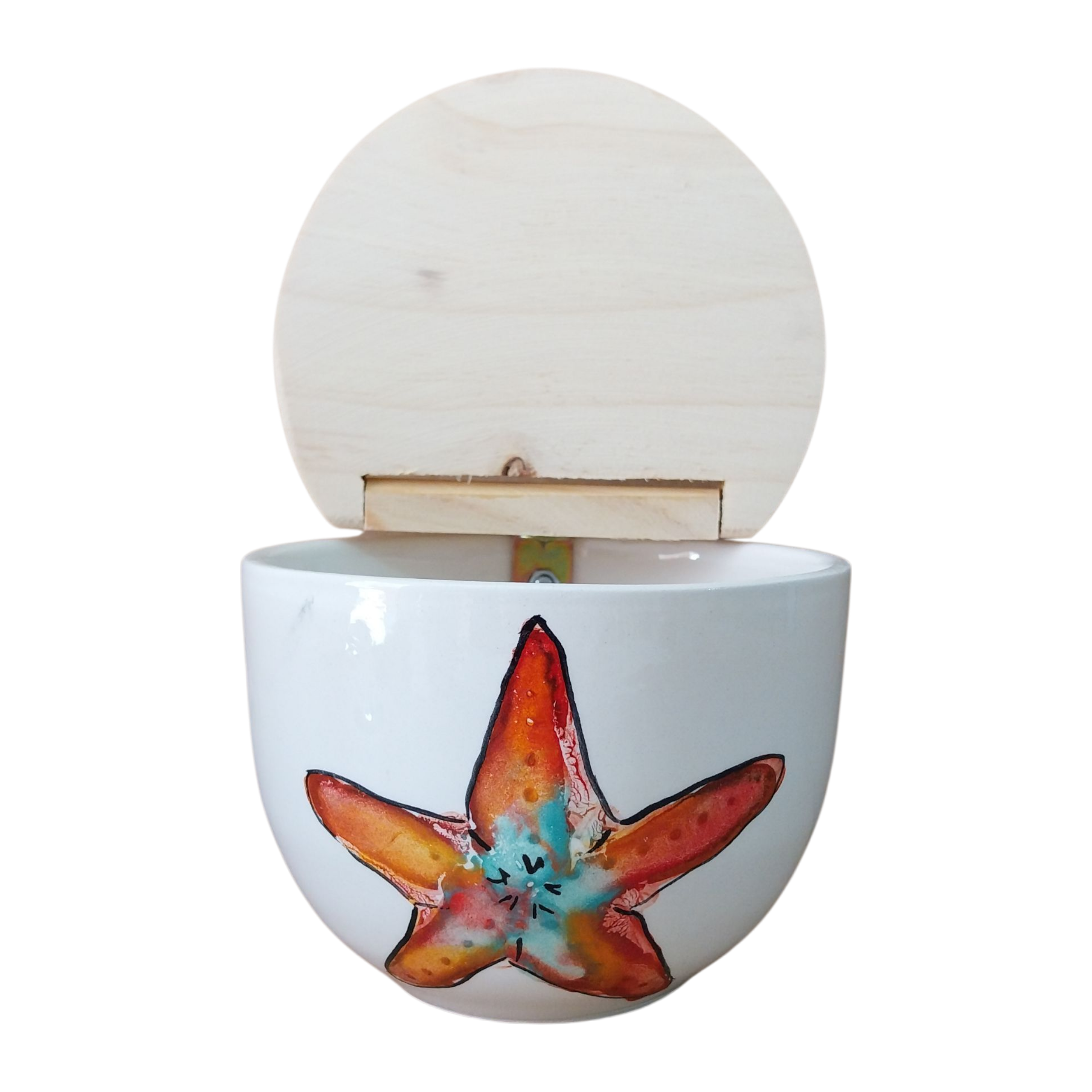 Este salero de cocina se caracteriza por su diseño artesanal, con una tapa de madera que asegura la frescura de la sal y un cuerpo de cerámica decorado con una estrella marina pintada a mano. Este detallado diseño artístico aporta un aire elegante y natural a cualquier entorno de cocina. Además de ser compacto y fácil de usar, su tapa de madera facilita el acceso a la sal, manteniéndola protegida de la humedad. Es ideal para quienes buscan un accesorio funcional que también destaque como elemento decorativo. Este salero es una pieza única que combina utilidad y belleza, convirtiéndose en un complemento esencial para cualquier hogar. Perfecto tanto para uso diario como para impresionar a tus invitados, este salero añade un toque de estilo marino a tu cocina.