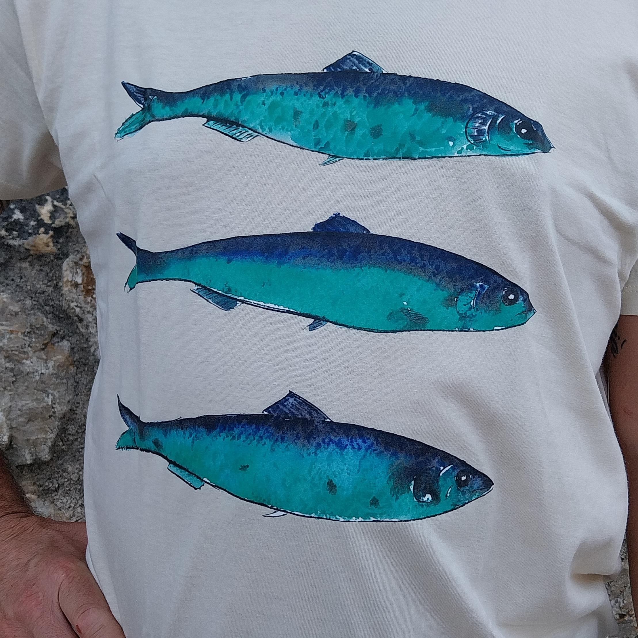 Camiseta unisex de manga corta en color crudo, confeccionada en 100% algodón de alta calidad. Presenta un diseño exclusivo y original de 3 sardinas creado por nuestra marca, lo que la convierte en una prenda única que no encontrarás en otro lugar. El tejido natural ofrece comodidad, suavidad y frescura durante todo el día. Perfecta para looks casuales, urbanos o de inspiración marina, ideal para hombres y mujeres que buscan destacar con estilo propio.
